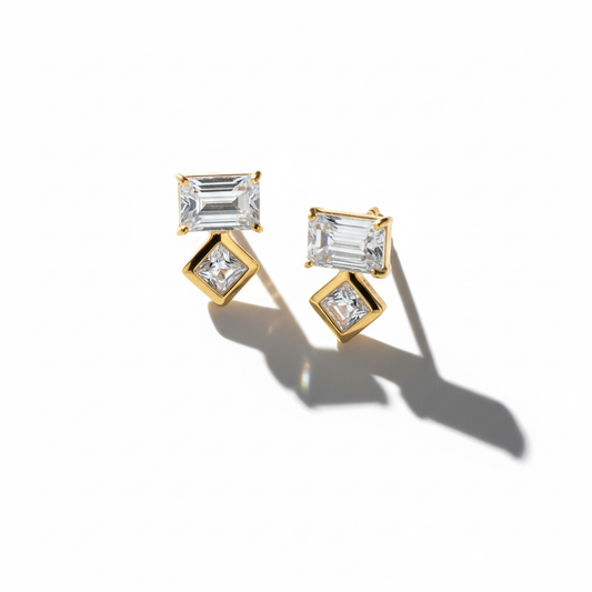 14 Karat Gold Plated Sterling Silver Baguette and Square CZ Stud Earrings, 4x6mm and 3.5mm