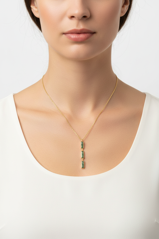14 Karat Gold Plated Sterling Silver Moss Agate Drop Necklace, 18+2 Inch Chain Length, 1.5 Inch Drop, Baguette Cut Stone