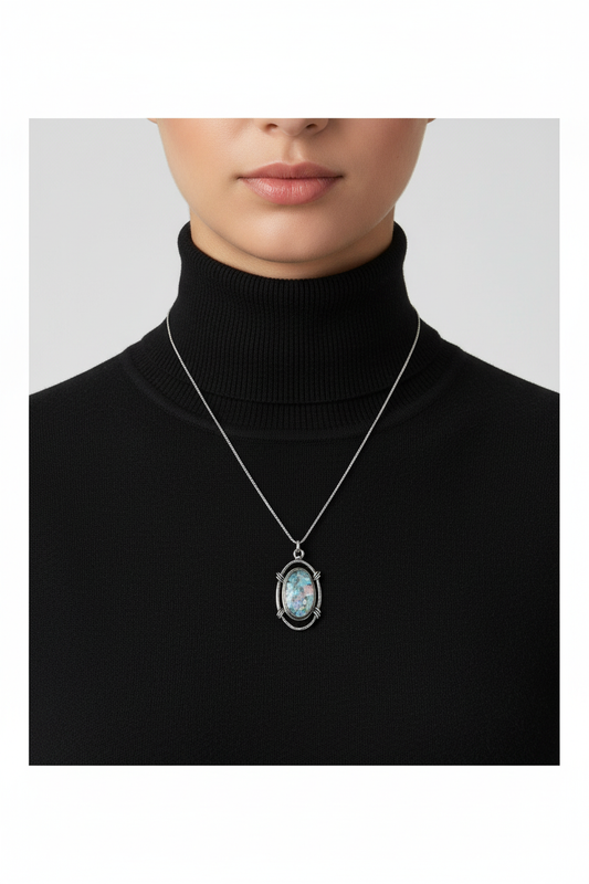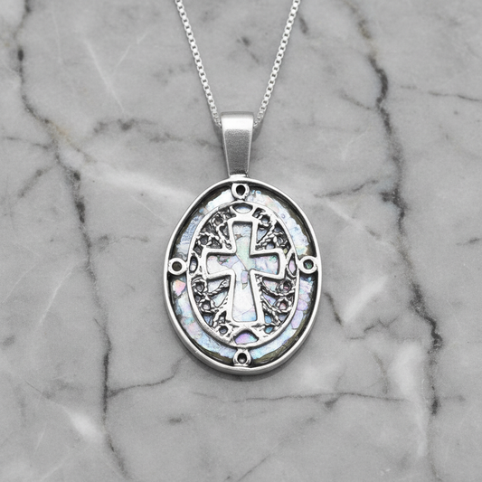 Ancient Roman Glass Cross Necklace - Sterling Silver Oval Cutout Pendant