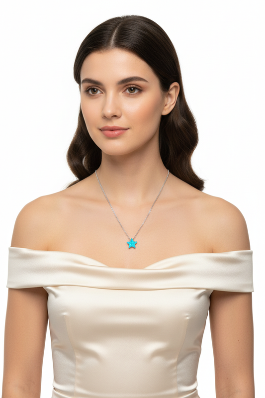 Sterling Silver Floating Opal Star Necklace, Rhodium Plated, Blue Synthetic opal , 16 Inch Chain with 2 Inch Extender, Lobster Clasp
