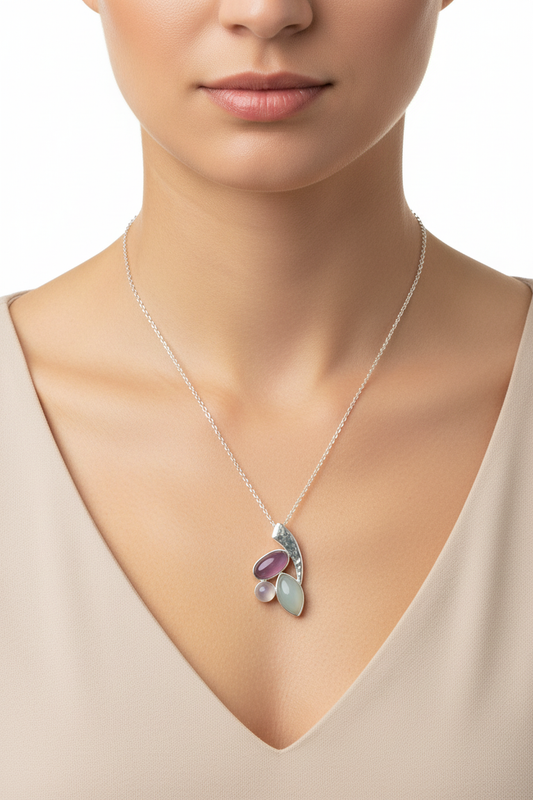 Multi-Stone Necklace - Sterling Silver Moonstone Pearl Chalcedony Pendant