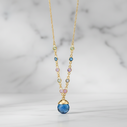14 Karat Gold Plated Sterling Silver Glass Drop Necklace, Blue Multi-Gemstone Pendant with Prasiolite, Amethyst, Labradorite, Pink Chalcedony, 16 Inch Chain