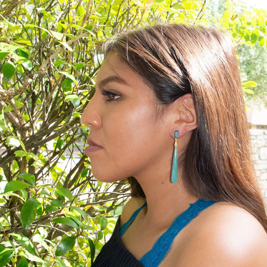 14 Karat Gold Plated Sterling Silver Earrings, Blue Glass and Green Chalcedony Drops, 67mm Length, Post Style, Irregular Polygon