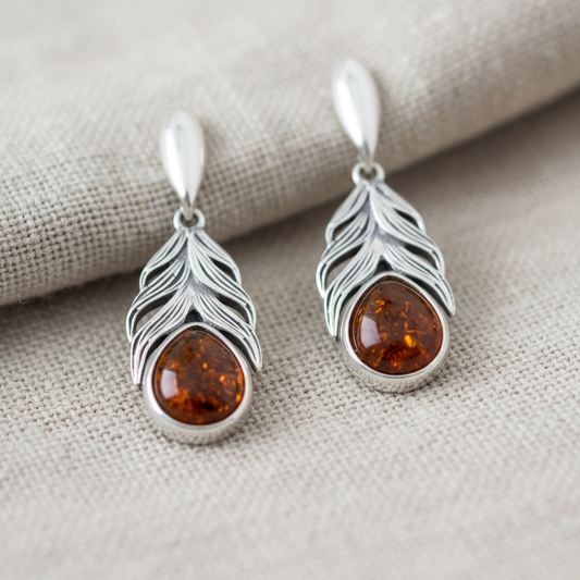 Baltic Amber Feather Earrings Oxidized 925 Sterling Silver 7.5x6mm 26.8mm
