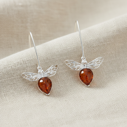 Baltic Amber Honey Bee Earrings Polished 925 Sterling Silver Poland 35.2mm