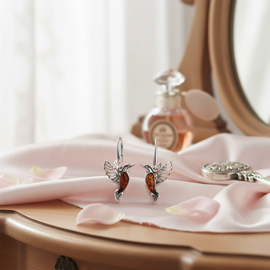 Baltic Amber Hummingbird Earrings Oxidized 925 Sterling Silver Lever Back 35mm