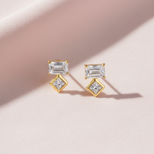 Baguette Square CZ Stud Earrings 14K Gold Plated 925 Sterling Silver 4x6mm