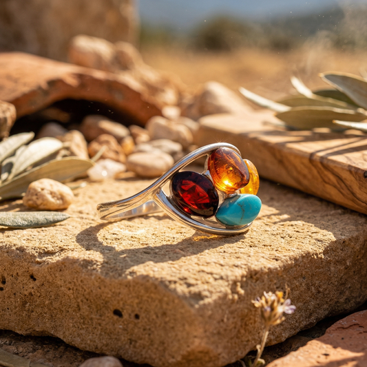 Baltic Amber & Turquoise Cutout Ring 925 Sterling Silver Multicolor Sizes 6-9