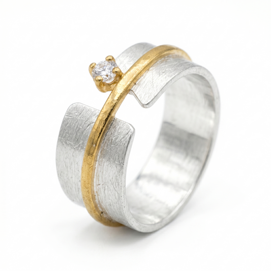 Art Deco Two Tone CZ Ring 925 Silver Satin Split Band Hammered Gold Sizes 5-9