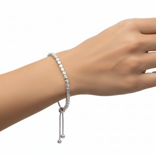 Sterling Silver Rhodium Plated Square Bead Adjustable Bolo Bracelet, Box Chain with 3.4mm Beads, 9.5 Inch Length, Made in Italy