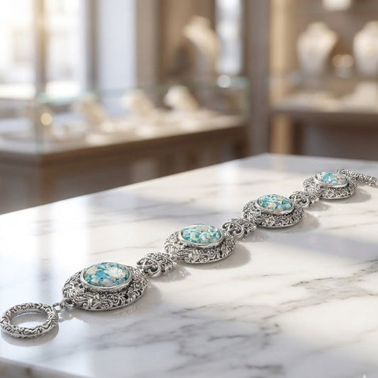 Sterling Silver Roman Glass Toggle Bracelet, Oxidized, 7.5 Inch, 13mm Ancient Glass Settings, Ornate Design