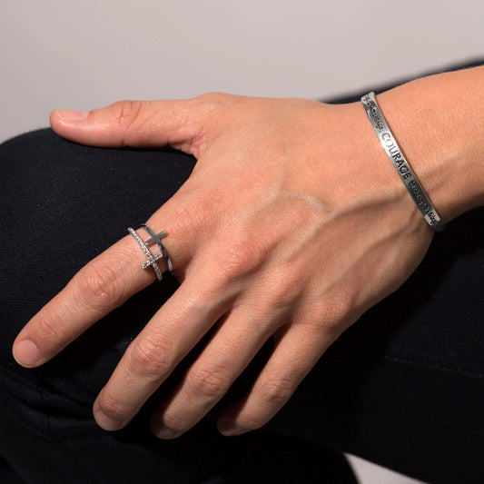 Sterling Silver Double Cross Ring with CZ, Rhodium Plated, 13.5mm Front Design, Split Band, 4mm Back