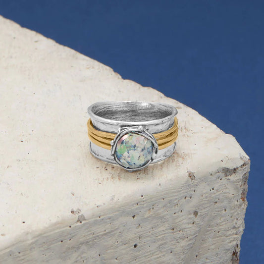Sterling Silver Roman Glass Spinner Ring with Rose Gold Plated Bands, Two-Tone, 11mm Glass, Oxidized Finish