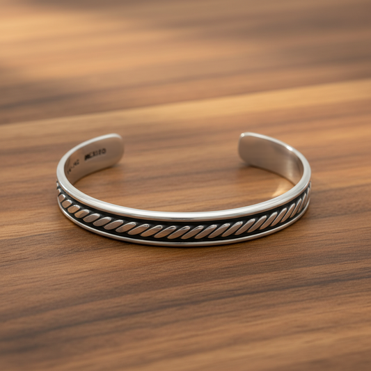 Sterling Silver Oxidized Rope Design Cuff Bracelet, Men's, Handmade in Mexico, 62mm x 47mm Wide, .925 Silver