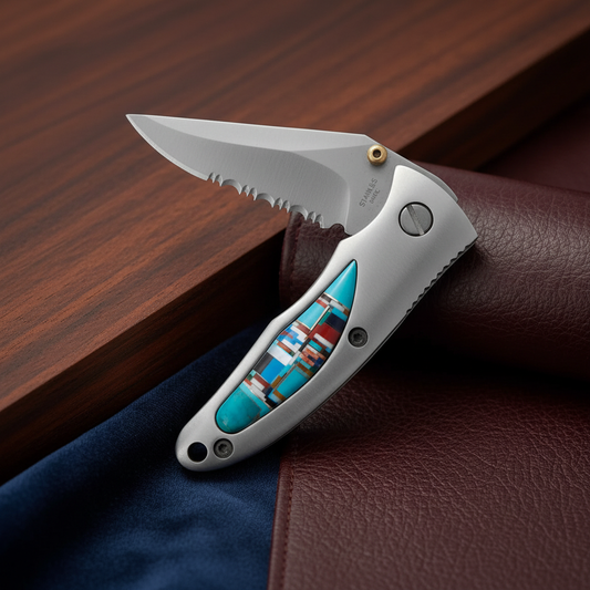 Stainless Steel Pocket Knife with Turquoise Inlay, 3 Inch Blade, 316L Steel, 25mm x 95mm