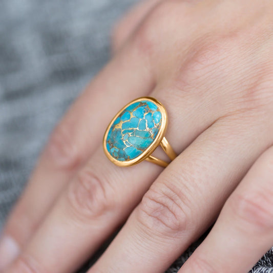 14 Karat Gold Plated Sterling Silver Turquoise Ring, Stabilized Copper Infused, 13x17.5mm Stone, 4mm Band, Sizes 6-10