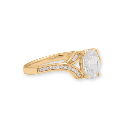 Sterling Silver Oval Solitaire Ring with CZ Band, 14K Gold Plated, 8mm x 6mm Center Stone, Sizes 6-9