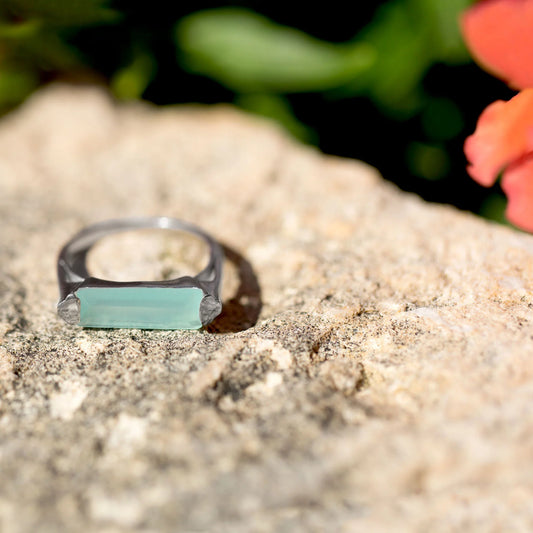 Sterling Silver Rhodium Plated Green Chalcedony Bar Ring, 5x14mm Stone, 1.5mm Band