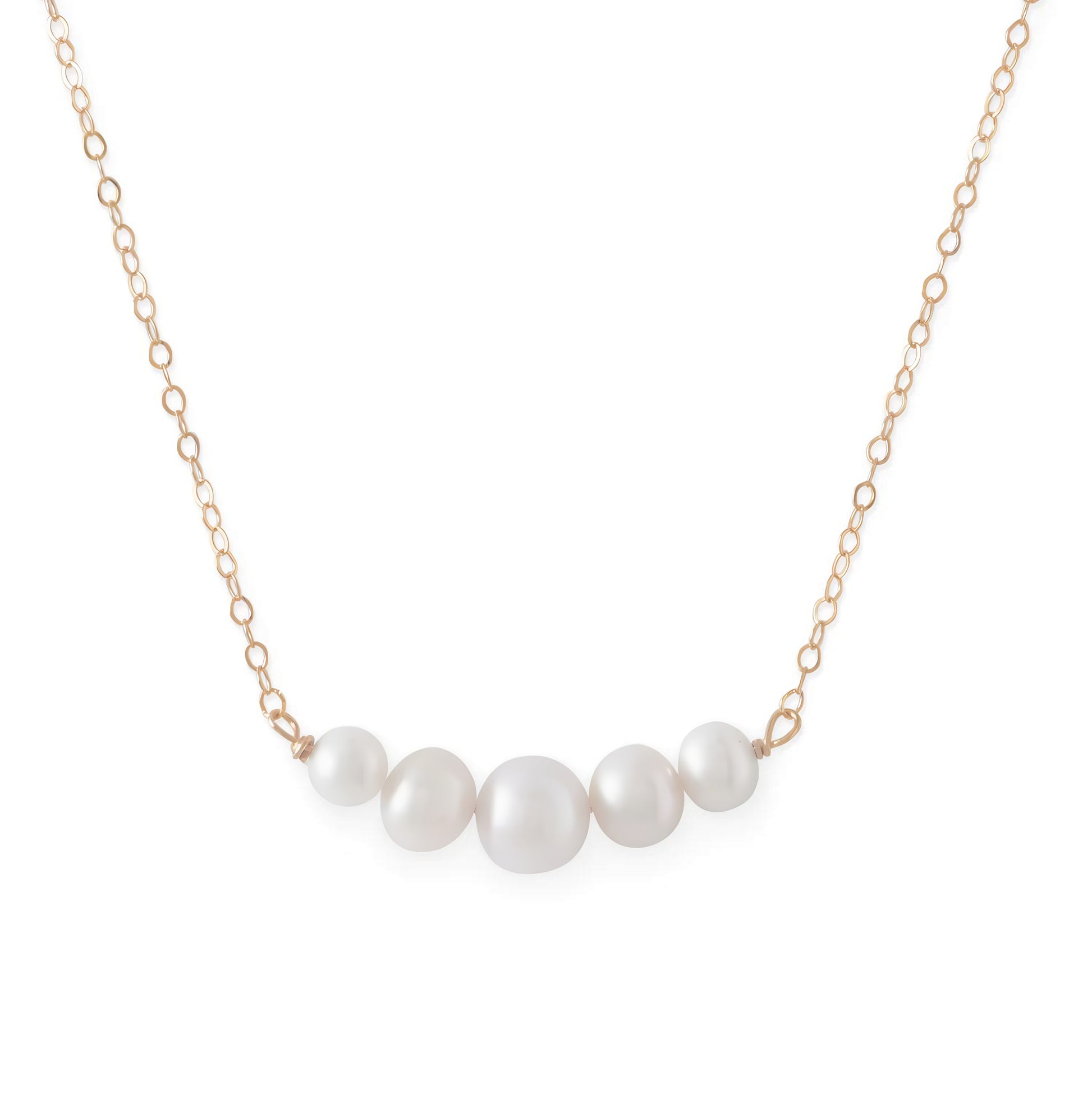 ELEGANT DESIGN: 14kt yellow gold cable chain necklace featuring a curved wire bar adorned with five cultured freshwater pearls in graduating sizes