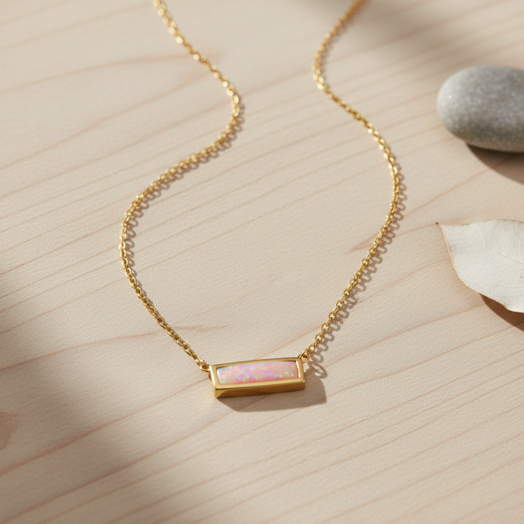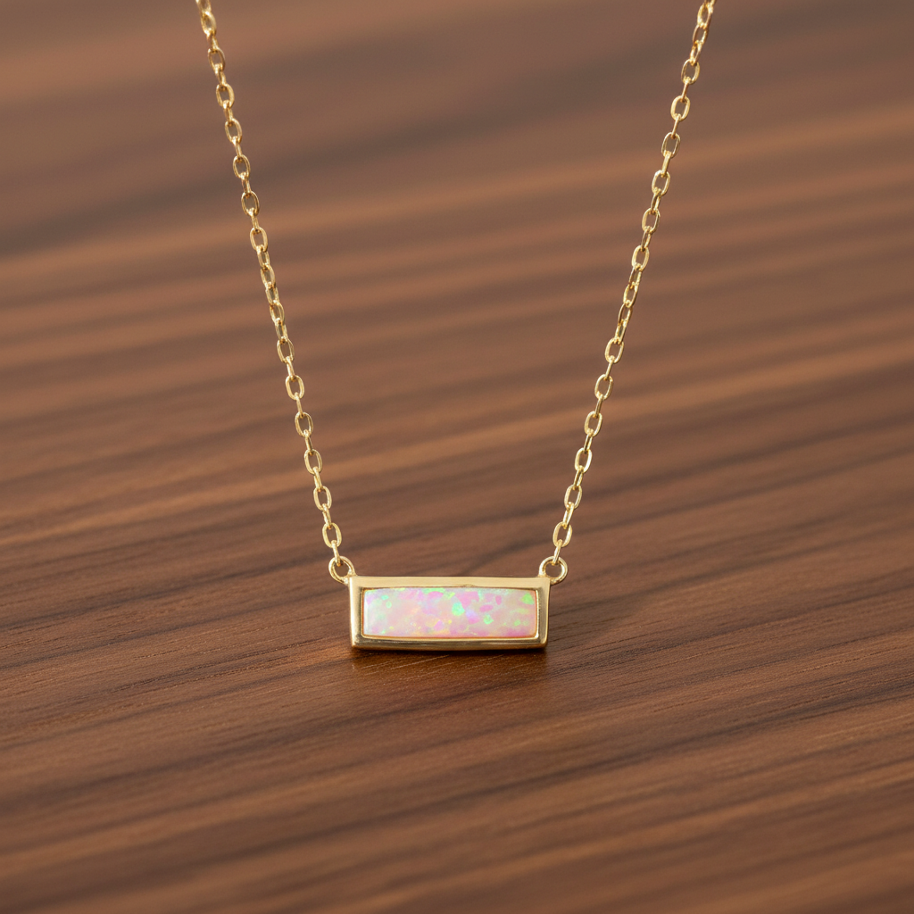 Elevate your everyday style with this delicate bar necklace featuring a stunning synthetic pink opal centerpiece. The 10.8mm x 3mm bezel-set opal bar creates an eye-catching focal point that catches and reflects light beautifully. Crafted from sterling silver with luxurious 14 karat gold plating, this necklace combines durability with sophisticated glamour. The 16-inch cable chain, complete with a 2-inch extension, allows for versatile styling and a comfortable fit. Secured with a reliable lobster clasp, this piece transitions seamlessly from day to night wear. The minimalist design makes it perfect for layering with other necklaces or wearing as a standalone statement piece. Each necklace showcases the quality of .925 sterling silver construction, ensuring lasting beauty and wear.