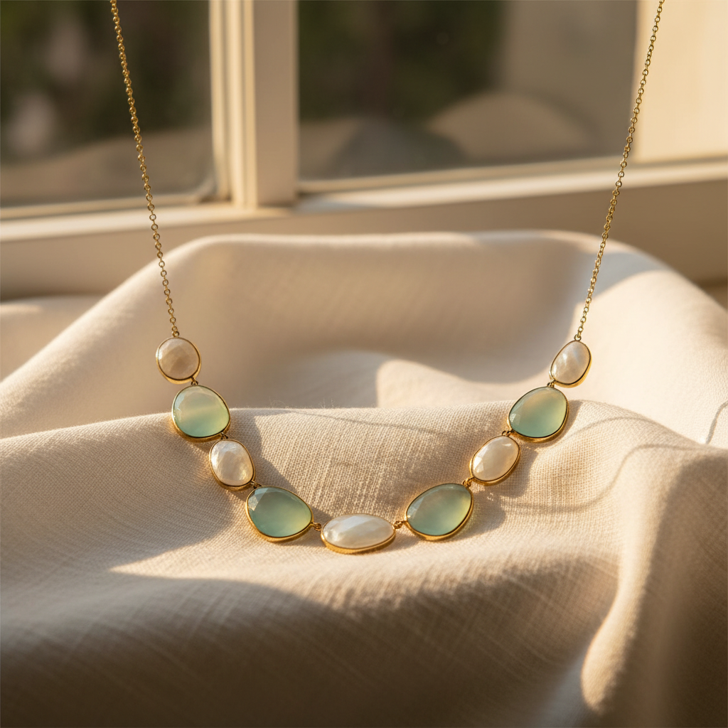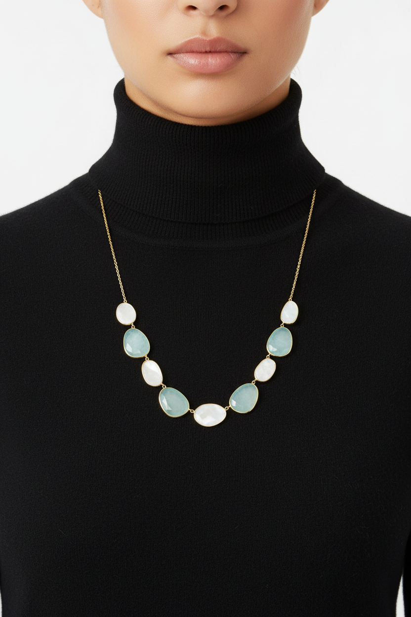 Elevate your style with this exquisite 16-inch necklace (plus 2-inch extension) that combines the mystical allure of rainbow moonstone with the serene beauty of green chalcedony. Crafted in sterling silver with luxurious 14 karat gold plating, this stunning piece features alternating bezel-set stones in irregular oval shapes. The design showcases four green chalcedony stones, each measuring approximately 15mm x 20mm, interspersed with rainbow moonstones in varying dimensions from 9mm x 16mm to 15mm x 20mm. The cable chain design provides both durability and elegance, while the secure lobster clasp ensures easy wear. Each stone is uniquely set to catch and reflect light, creating a mesmerizing interplay of colors that transitions seamlessly from the ethereal sheen of moonstone to the tranquil green of chalcedony. This versatile necklace adds a touch of sophistication to both casual and formal attire.