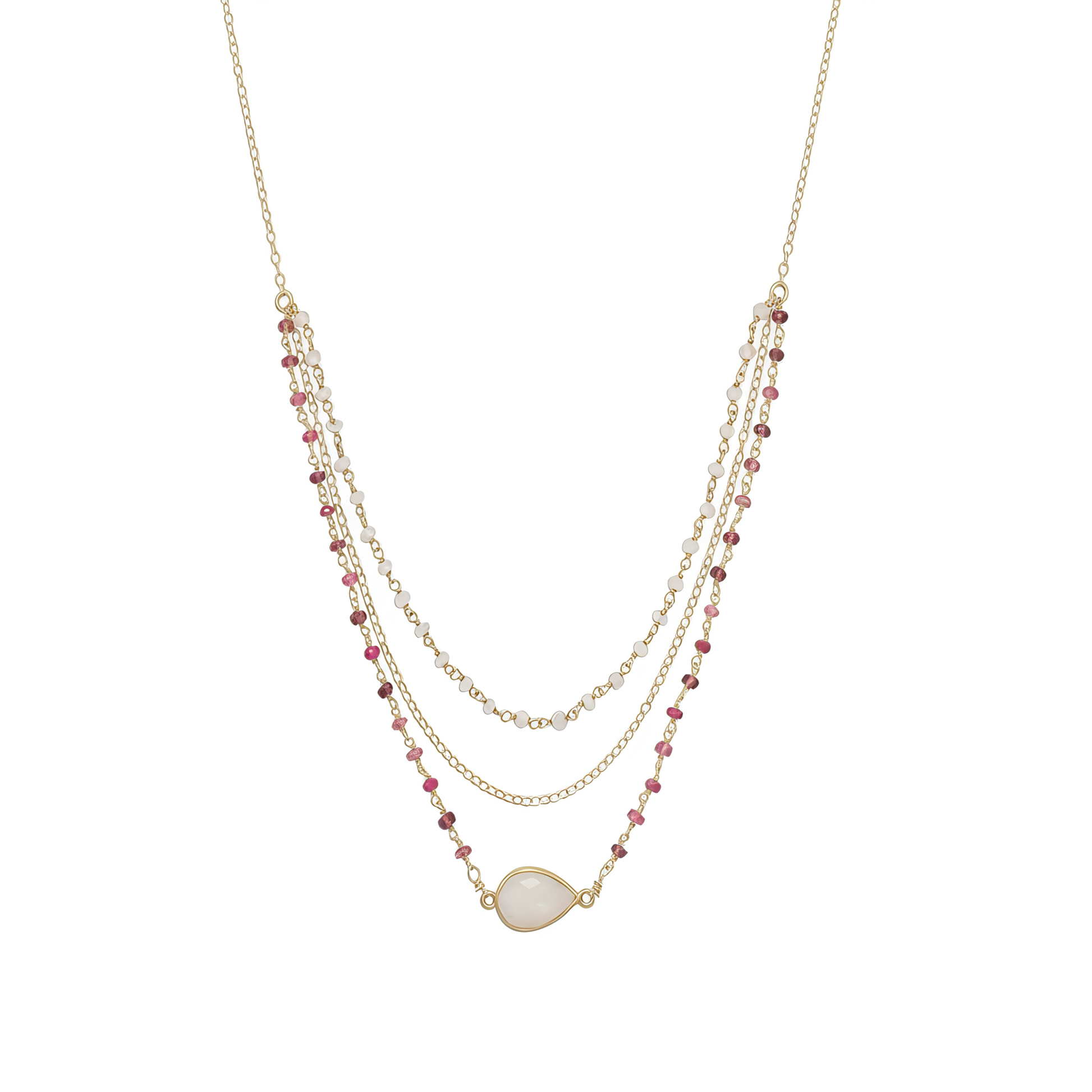 Elevate your style with this exquisite layered necklace featuring delicate strands of gold plated sterling silver beaded chains. The stunning centerpiece showcases a 10mm x 15mm pear-shaped faceted rainbow moonstone, perfectly complemented by dainty rainbow moonstone and tourmaline accents measuring 3mm x 4mm. This versatile piece is crafted with 14/20 gold filled components and features three graduated lengths at 16", 17", and 18", creating an elegant cascading effect. The secure lobster clasp closure includes a 2" extension chain for adjustable comfort. Each strand is thoughtfully designed to catch the light, while the moonstone's natural iridescence adds a magical touch to any outfit. The combination of sterling silver and gold filled elements ensures both beauty and durability, making this necklace a timeless addition to your jewelry collection.