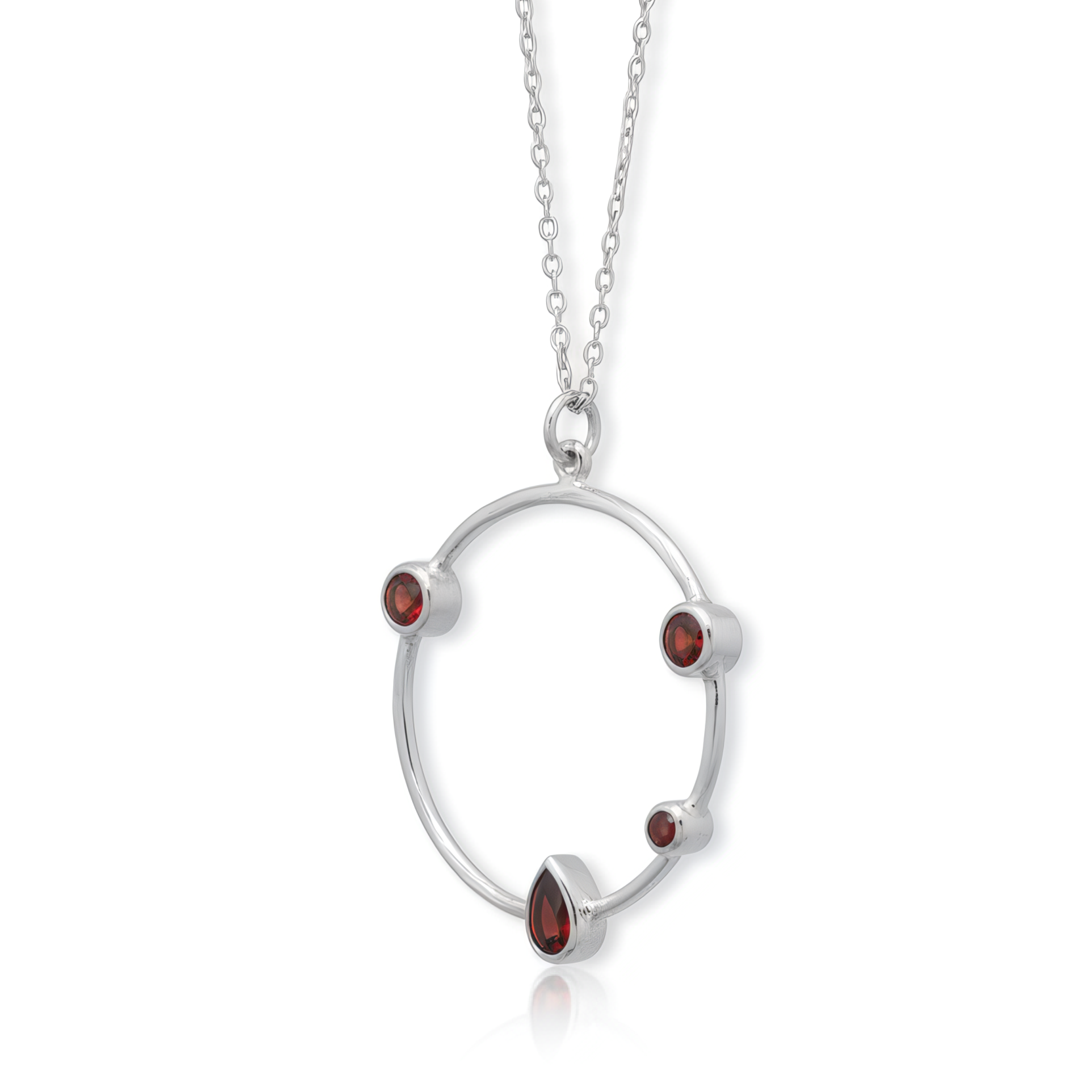 DESIGN FEATURES: Sterling silver necklace with a striking 25mm hammered circle pendant adorned with garnet stones in varying sizes