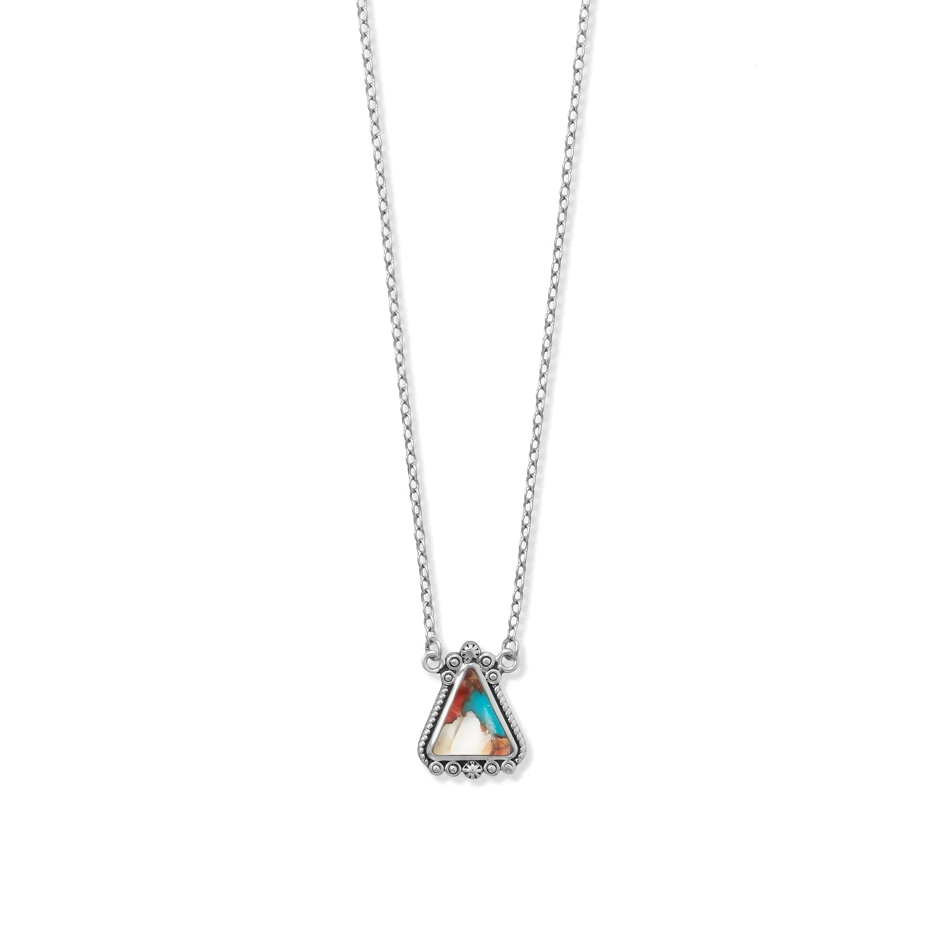 DESIGN FEATURES: Sterling silver necklace with unique tri-shape pendant featuring spiny oyster and turquoise compressed stone, enhanced with rope and bead detailing