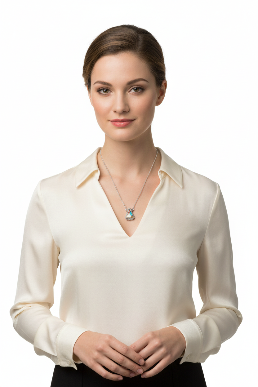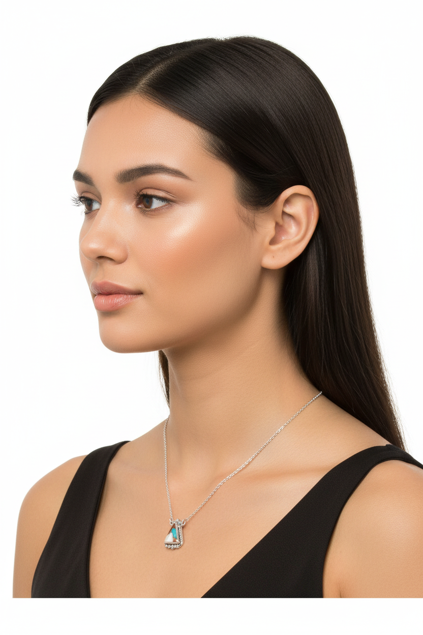 PENDANT SIZE: Eye-catching 10mm x 11mm tri-shape pendant crafted with compressed spiny oyster and turquoise stones