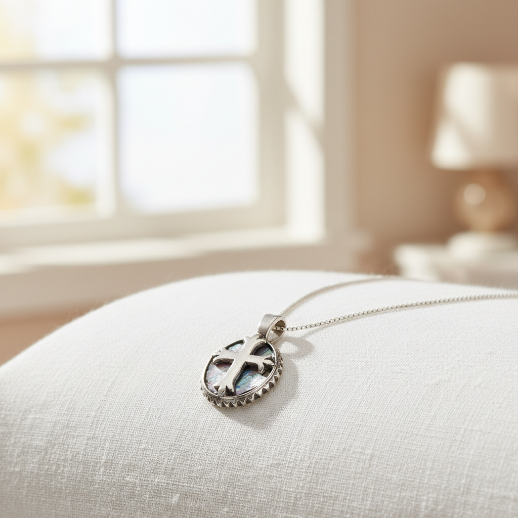 This elegant necklace features an 18-inch oval Roman glass cross pendant (14mm x 16mm) hanging from a delicate 1mm box chain with secure lobster clasp. The authentic Roman glass (approximately 2,000 years old) varies in color, adding historical charm and uniqueness to this meaningful design. Crafted from 925 sterling silver for timeless beauty.