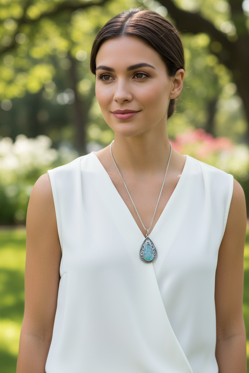 Discover timeless elegance with this stunning 18-inch oxidized sterling silver necklace, featuring a beautifully crafted pear-shaped pendant. The pendant's intricate cutout design (30.5mm x 18.2mm) showcases a remarkable piece of ancient Roman glass (17mm x 9.8mm). Secured with lobster clasp, includes Certificate of Authenticity.