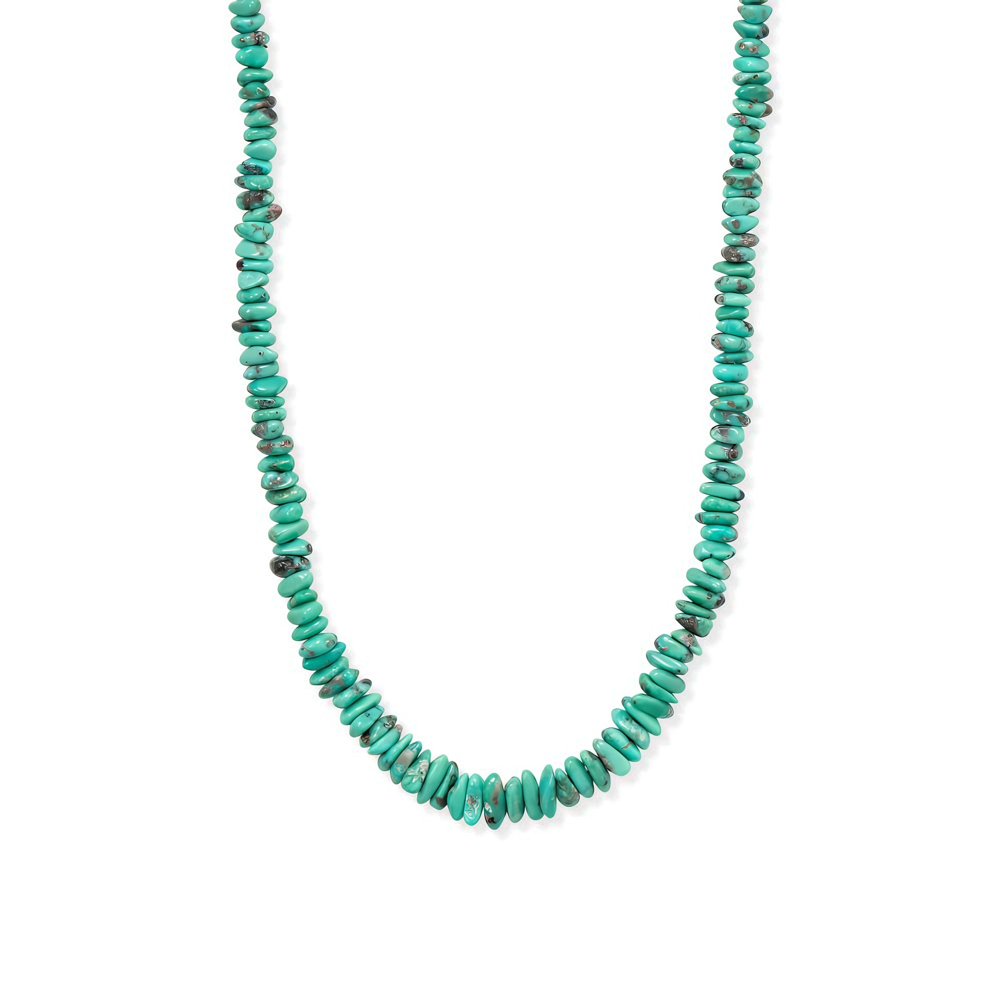 Discover the raw beauty of earth's treasures with this stunning 19-inch Mexican Campitos turquoise nugget necklace. Each piece showcases naturally graduating turquoise chips, ranging from an eye-catching 12mm down to delicate 4mm, creating a mesmerizing cascade effect. Expertly crafted in the USA using genuine .925 sterling silver, this necklace strikes the perfect balance between rustic charm and refined elegance. The secure hook and eye closure ensures comfortable wear, while the authentic turquoise adds a distinctive southwestern flair to any outfit. Each necklace tells its own unique story through subtle variations in the turquoise coloring, making your piece truly one-of-a-kind. Whether dressed up or down, this versatile necklace makes a striking statement while celebrating the natural beauty of Mexican Campitos turquoise.