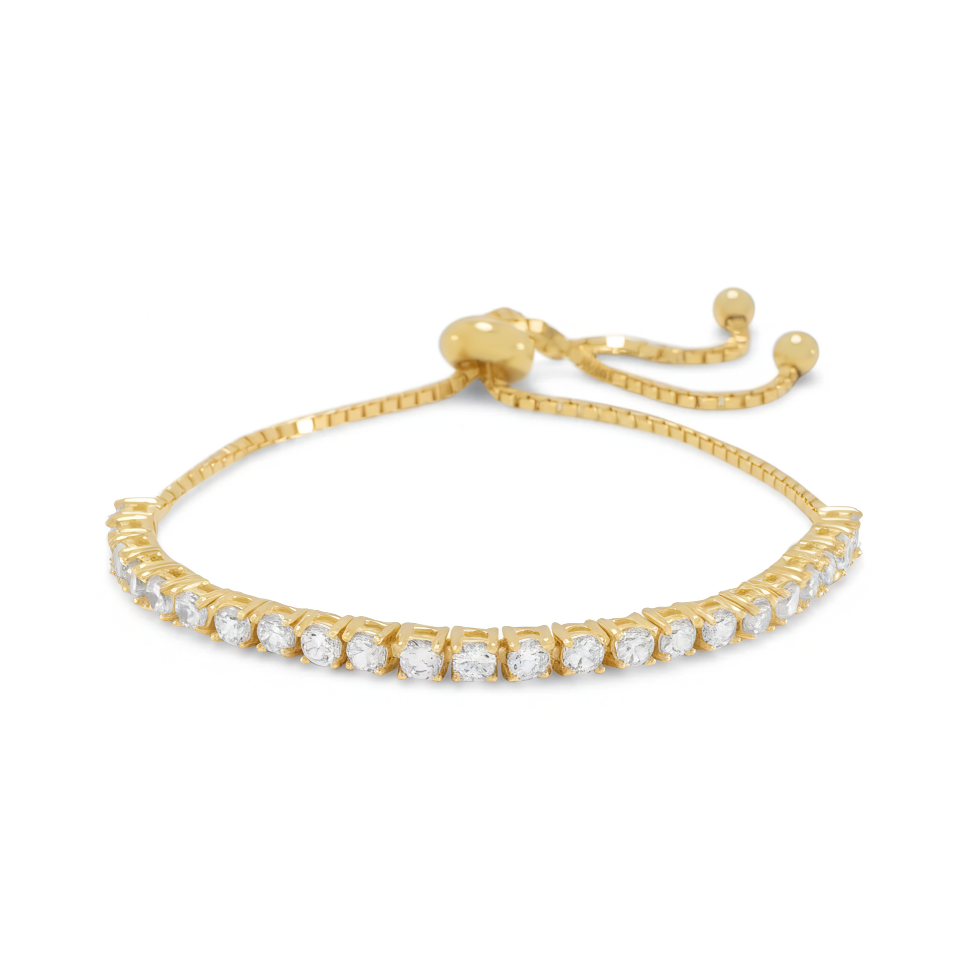 Add a touch of elegance to your jewelry collection with this adjustable bolo bracelet. Crafted from sterling silver and adorned with sparkling 3mm cubic zirconia stones, this bracelet features a luxurious 14 karat gold plating that gives it a rich, sophisticated look. The versatile box chain design adjusts easily up to 9 inches using the gold-plated stopper bead, ensuring a perfect fit for most wrist sizes. The .925 sterling silver base provides durability and lasting quality, while the gleaming gold finish adds a premium touch to any outfit. Whether worn alone or stacked with other bracelets, this stunning piece transitions seamlessly from day to evening wear, making it an ideal accessory for any occasion.