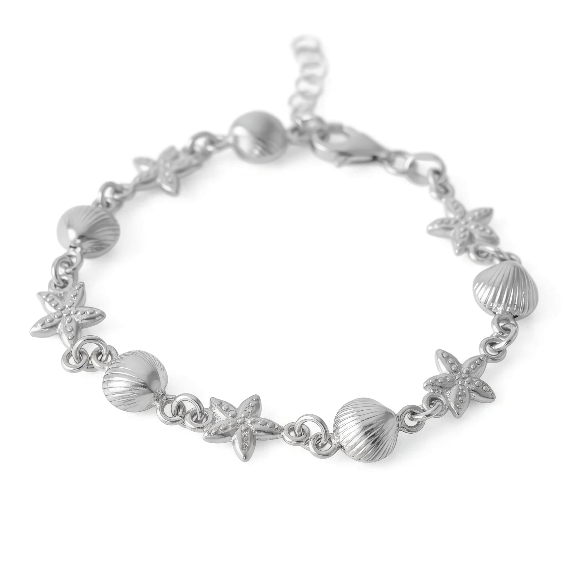-Sterling silver bracelet featuring alternating shell (7.9mm x 7.7mm) and starfish (9mm x 9mm) charms in a delicate pattern