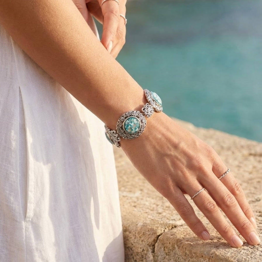 Step into history with this exquisite 7.5-inch toggle bracelet that seamlessly blends ancient artistry with contemporary elegance. Crafted from premium .925 sterling silver with a sophisticated oxidized finish, this ornate piece showcases four stunning settings of authentic ancient Roman glass, each measuring 13mm in diameter. The toggle closure adds both security and style, while the intricate ornate design work in the silver setting creates a perfect backdrop for the timeless Roman glass pieces. Each bracelet comes with a Certificate of Authenticity, validating the historical significance of the glass elements. This remarkable piece of wearable history makes a stunning addition to any jewelry collection, offering a unique combination of classical Roman craftsmanship and modern sterling silver artistry.