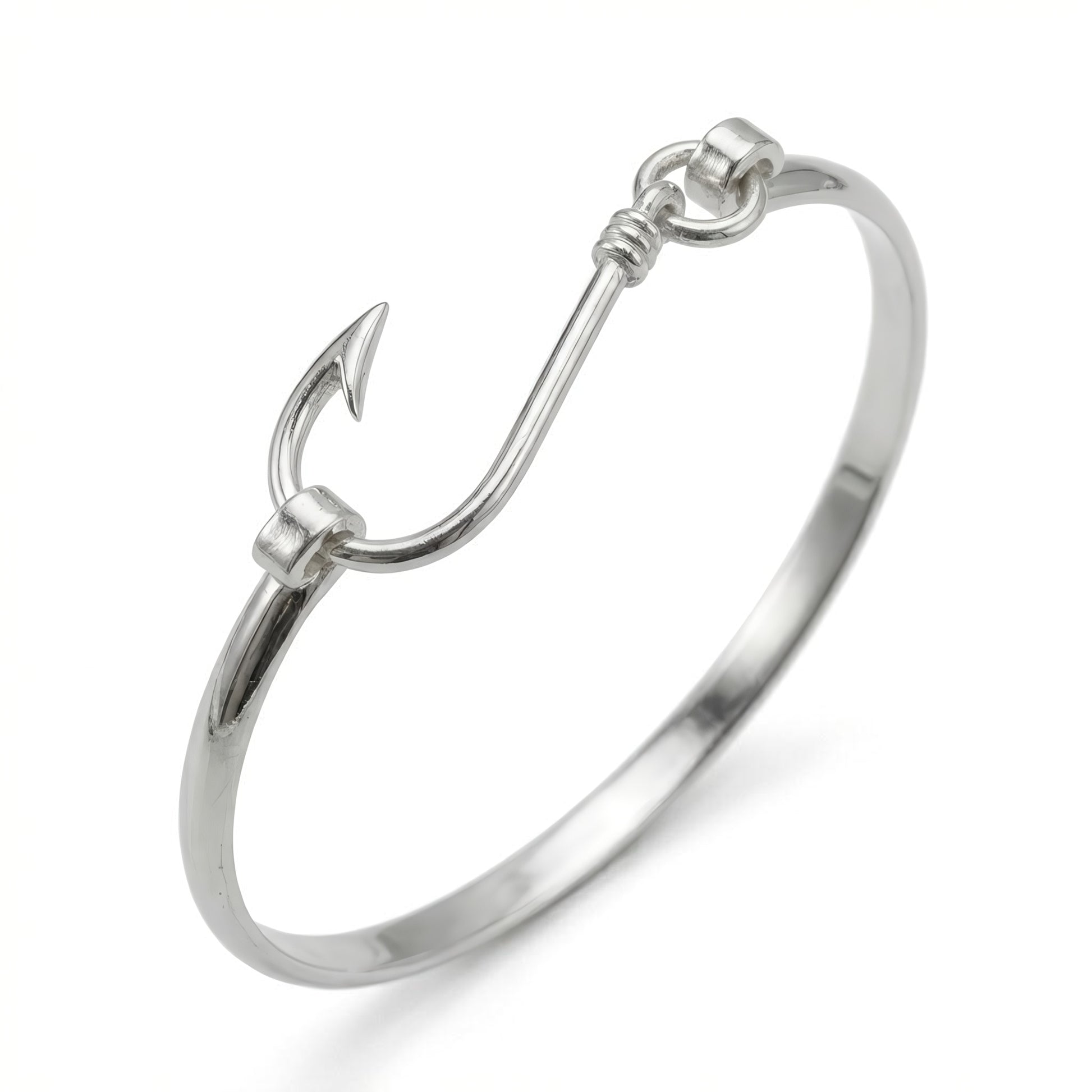 Fish Hook Bangle Bracelet - Sterling Silver Rhodium Plated Nautical
