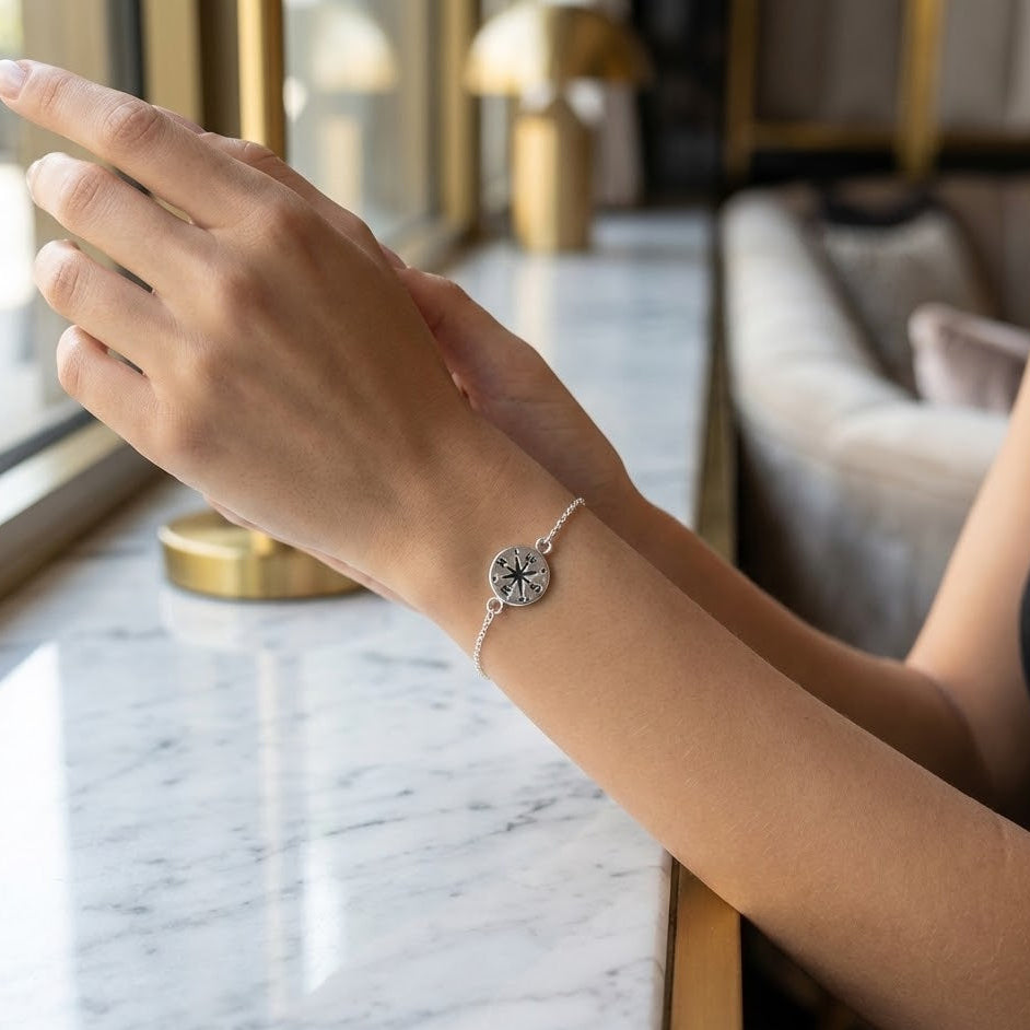 Embark on life's journey with this exquisite sterling silver compass bracelet, a perfect blend of style and symbolism. The centerpiece features a beautifully hammered compass disk measuring 10.5mm in diameter, creating a distinctive texture that catches the light with every movement. Crafted from premium .925 sterling silver, this bracelet offers a versatile 7.5-inch length that provides a comfortable fit for most wrists. The secure spring ring closure ensures your bracelet stays in place during your daily adventures. Whether paired with casual attire or dressed up for special occasions, this bracelet serves as both a fashionable accessory and a meaningful reminder to follow your own path. The polished silver finish complements any outfit, making it an ideal piece for everyday wear or a thoughtful gift for someone special.
