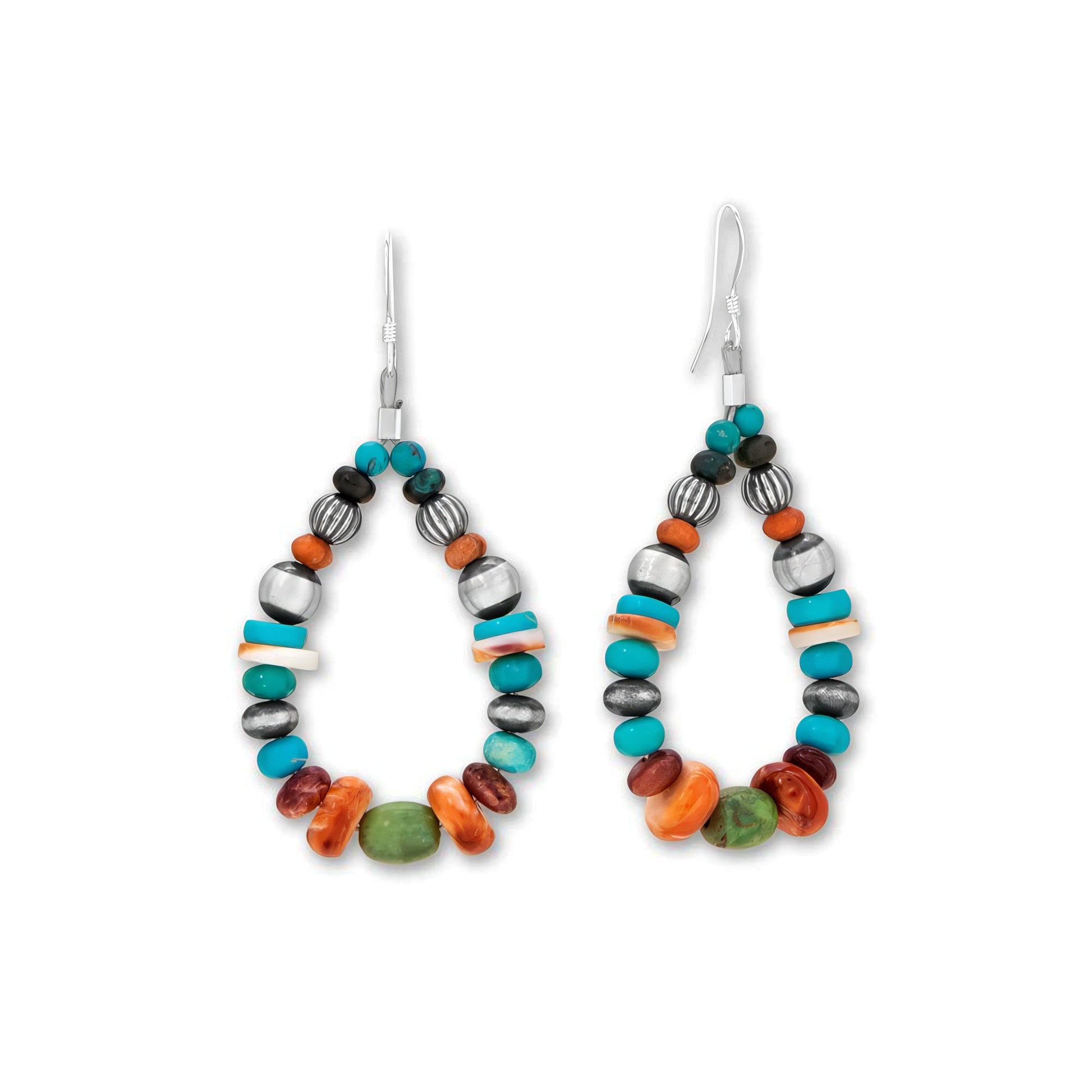 Add a pop of color to your outfit with these stunning Multi Stone Pear Drop Earrings. Handcrafted in the USA, these earrings feature a beautiful combination of Kingman turquoise, spiny oyster, black onyx, and green turquoise stones in graduated sizes. The sterling silver french wire design adds a touch of elegance, making these earrings perfect for any occasion.