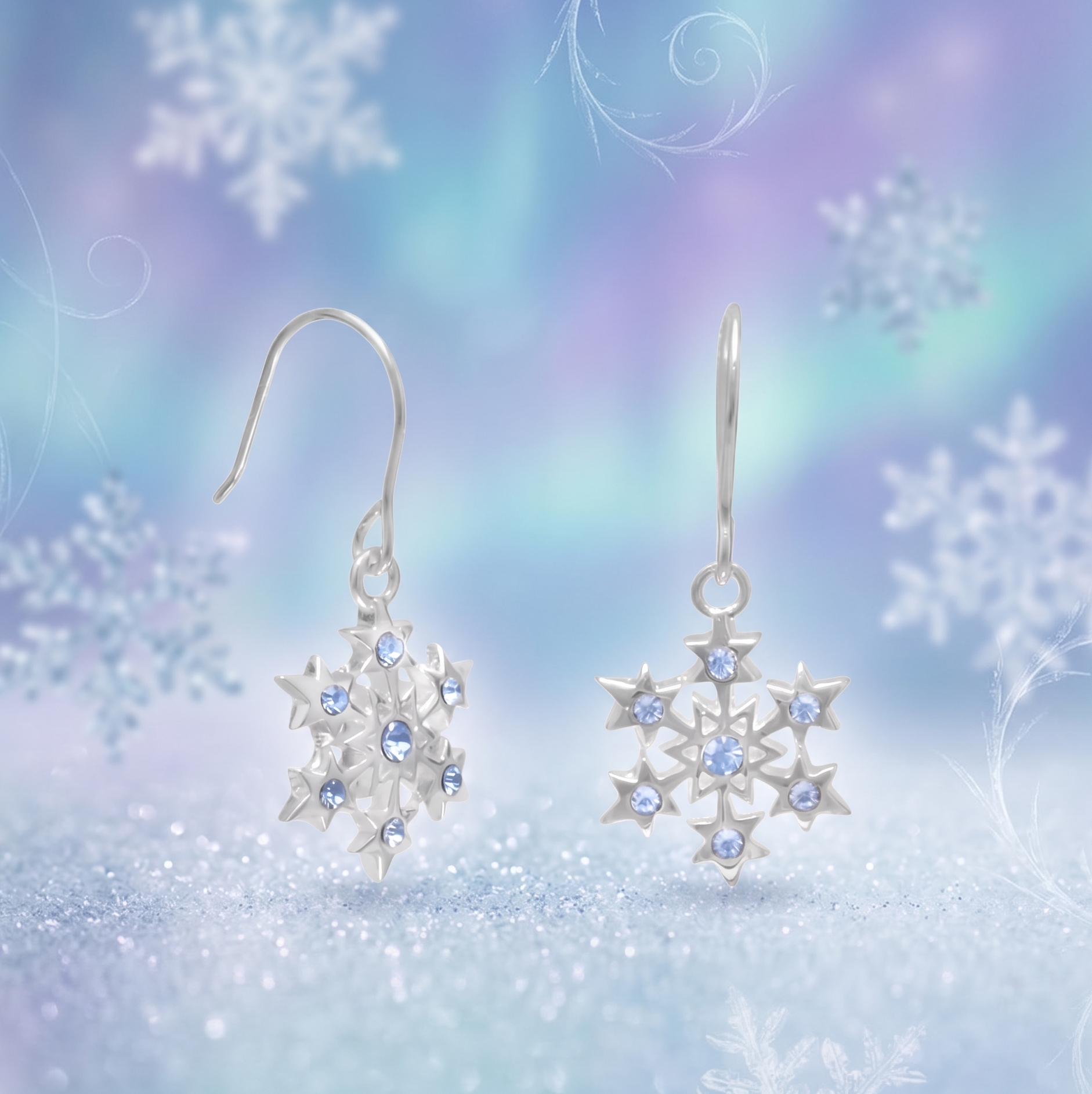 The aqua crystals are precision-set across the snowflake design in two sizes (2mm and 1.4mm), creating a layered, multi-dimensional sparkle that catches light beautifully from every angle. The sterling silver snowflake frame provides a bright, clean setting that enhances the crystals' aqua color and brilliance. Sterling silver is hypoallergenic and gentle on sensitive ears.